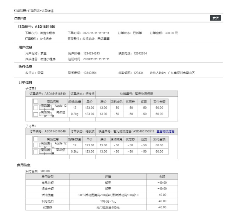传统订单详情其涵盖的内容信息和其他的模块息息相关,比如做了营销功能、商品购物车,这类信息就会增加,同时站在管理角度,订单详情信息越详细越好,方便做售后与维护。