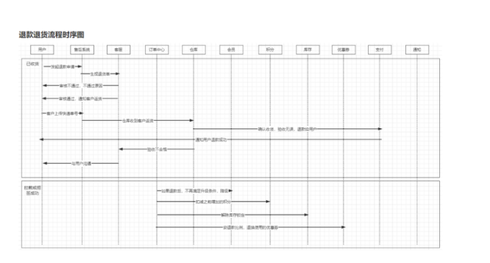 如下图是逆向流程中的退款退货流程,相比仅退款,流程会有区别。虽然达到精细化电商运营的同时,却极大增加了订单系统的维护成本,比如退款退货需要系统有退货验收的子功能