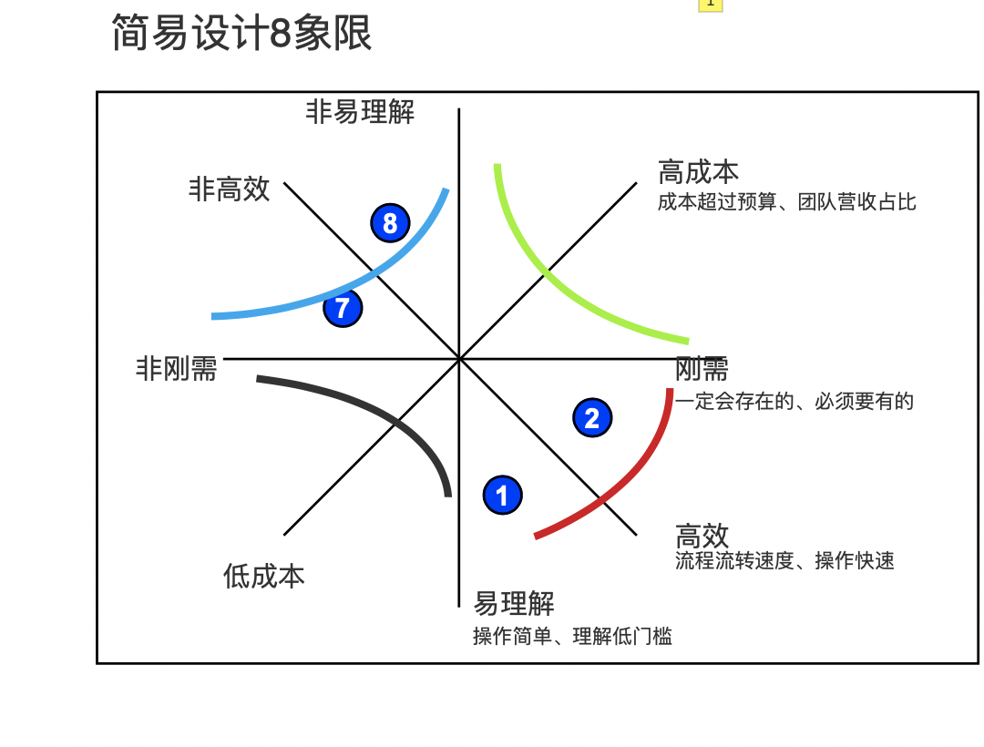 站在简易设计角度,我们可以通过简易设计八象限来完成需求过滤,我们围绕高成本、刚需、高效、易理解来把产品设计的需求都集中在图里的第一、第二象限,这类需求带来的产品设计时是刚需、且高效的、同事还是易理解和低成本的。